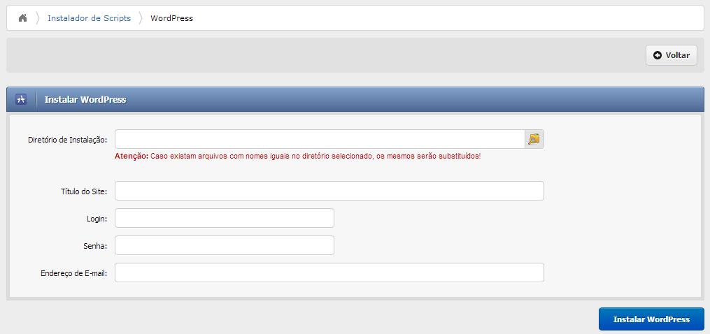 Será listados todos os scripts disponíveis. Agora basta escolher um deles clicando em Instalar. Vamos utilizar como exemplo o Wordpress.